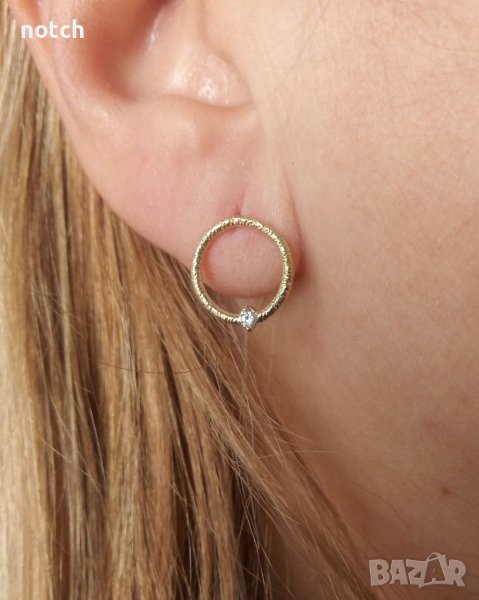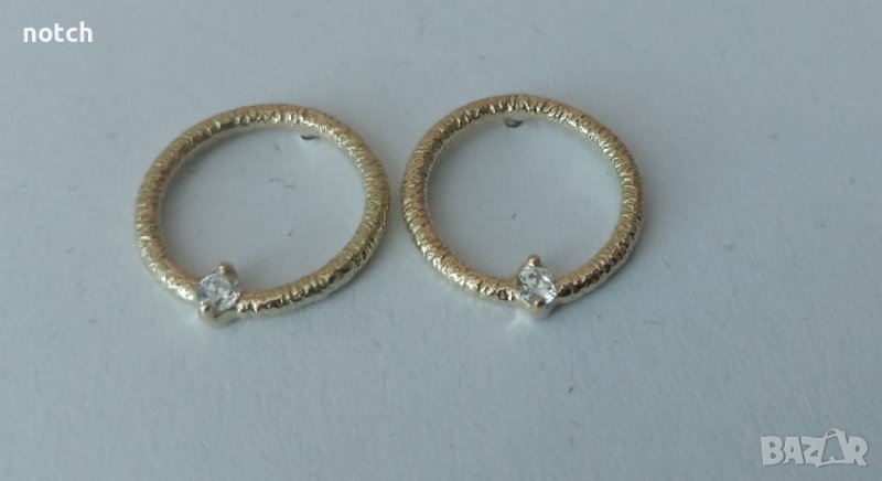Обеците са изработени от жълто злато 14 карата. Мога да се направят и от бяло злато или сребро и с различен вид камъни. Камъните са 2мм. циркони. Диаметърът на обеците е 1.2см.
