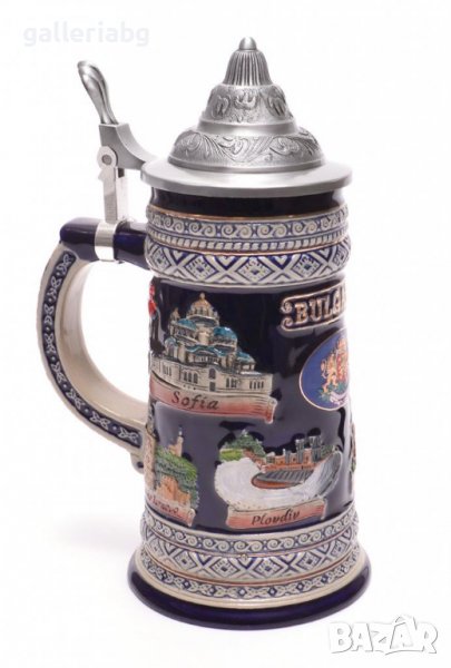 Сувенирна порцеланова чаша с метално капаче. Декорирана с красиви релефни орнаменти и забележителности от , Рилския манастир, Варна, Пловдив, София и Велико Търново. Вместимост на чашата - 750 мл.