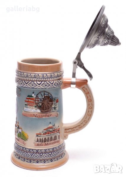 Сувенирна порцеланова чаша с метално капаче. Декорирана с красиви релефни орнаменти и забележителности от , Рилския манастир, Варна, Пловдив, София и Велико Търново. Вместимост на чашата - 750 мл.