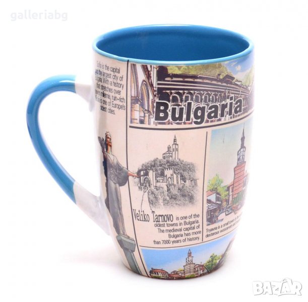Сувенирна керамична чаша, декорирана със забележителности от София, Пловдив, Трявна, Рилски манастир и Велико Търново.
