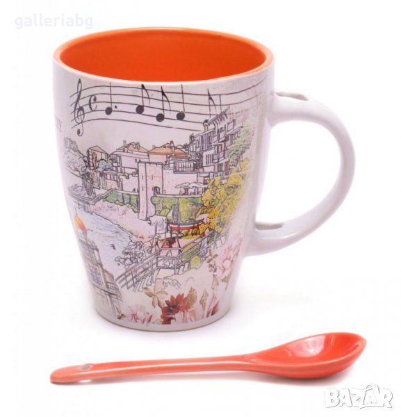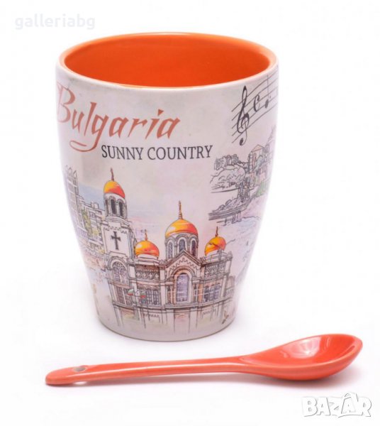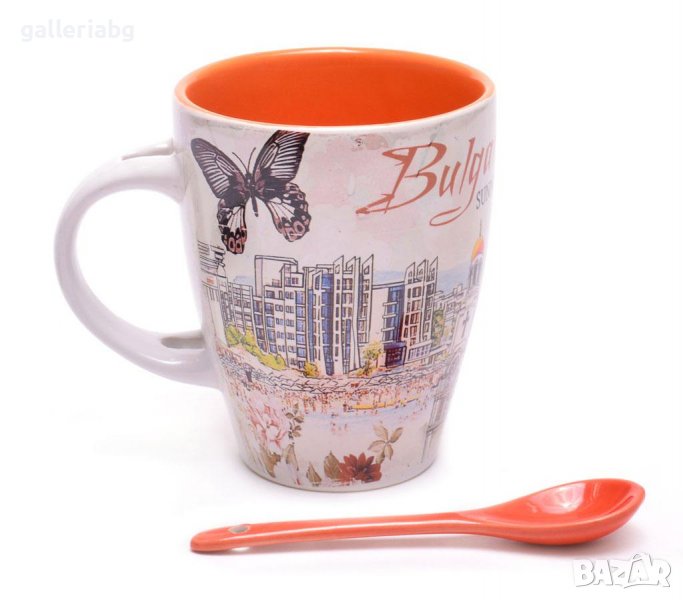 Сувенирна керамична чаша с лъжичка, декорирана със забележителности от Българското Черноморие.