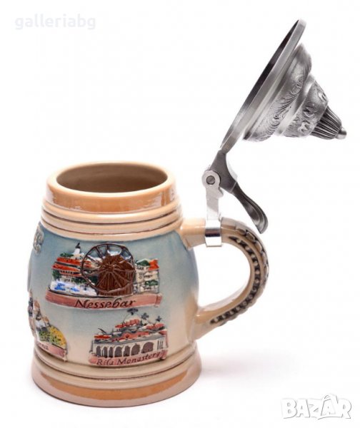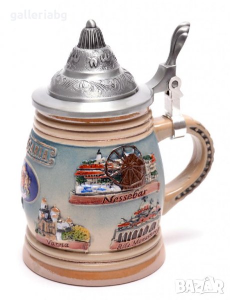 Сувенирна порцеланова чаша с метално капаче. Декорирана с красиви релефни орнаменти и забележителности от , Рилския манастир, Варна, Пловдив, София и Велико Търново. Вместимост на чашата - 250 мл.