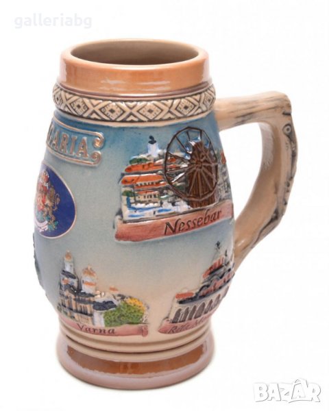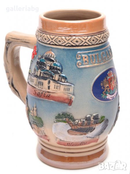 Сувенирна порцеланова чаша, декорирана с красиви релефни орнаменти, Гербът на Р. България и забележителности от , Рилския манастир, Варна, Пловдив, София и Велико Търново. Вместимост на чашата - 450 мл.
