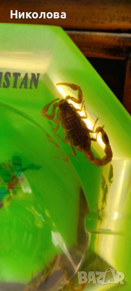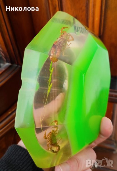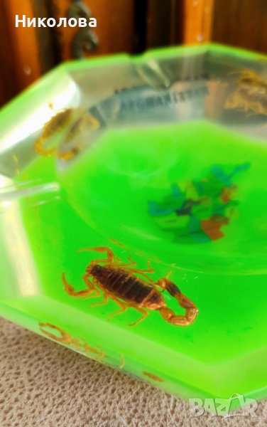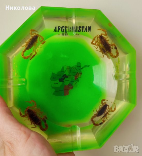 Пепелник от Афганистан с вградени истински скорпиони.Материалът е дебела пластмаса,най- вероятно епоксидна смола.