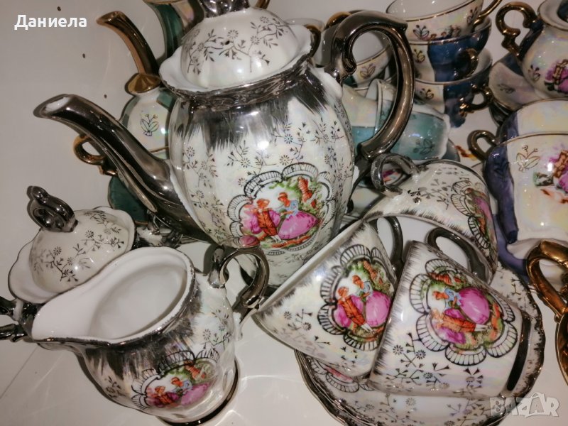 Бароков сервиз за кафе от порцелан. Сервиза е с богати сребърни релефни орнаменти, нежни рисунки и преливащи цветове (перлен ефект) от седеф.