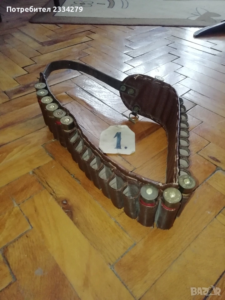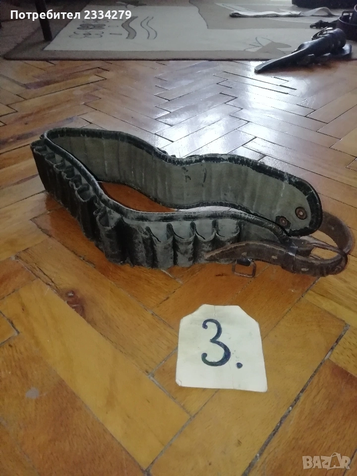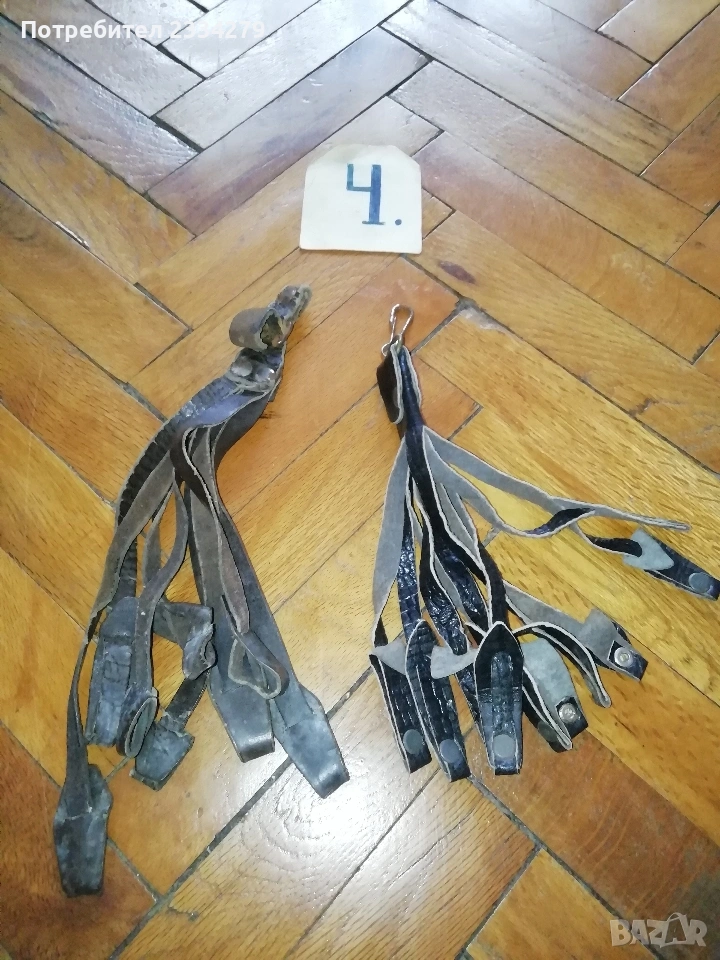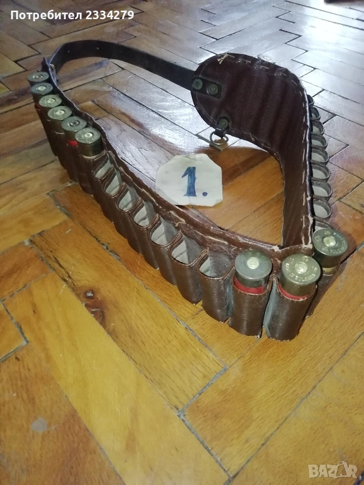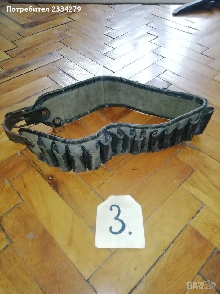 N:1 нормален естесвено кожен колан от 60-70години, цена 10€.(има малки забележки). N:2 патрондаж за декорация изработен от естествена кожа, цена 10€. N:3 нормален, изработен от изкуствен капронов плат модел от 90-те години, цена 10€. Може да се използва или за декорация на ловен кът,заведение. N:4 две кожени бесилки за прострелян дивеч с цена 7€. за брой.
