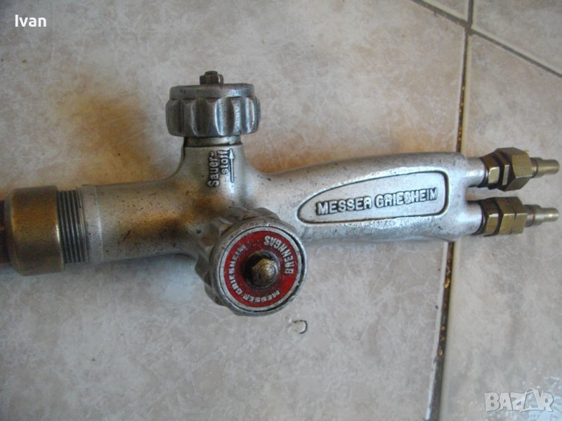 ОПИСАНИЕ на резак дълъг. Ползван, в ОТЛИЧНО техническо/работно състояние. Марка на дръжката - MESSER GRIESHEIM /една от най-качествените и скъпи в света/. Производство - Нидерландия. Цялостна дължина на резака - 63 см. Дръжка ицзцяло алуминиева, с два бронзови поставени отзад адаптери бърза връзка за скачване с маркучите на оксижен. 2 въртока алуминиеви. Тръба бронз - 38 см, медна голяма контактна дюза - дължина 80 мм с 1 голяма дупка за пламъка. Цена на резака от обявата - 149 лв.