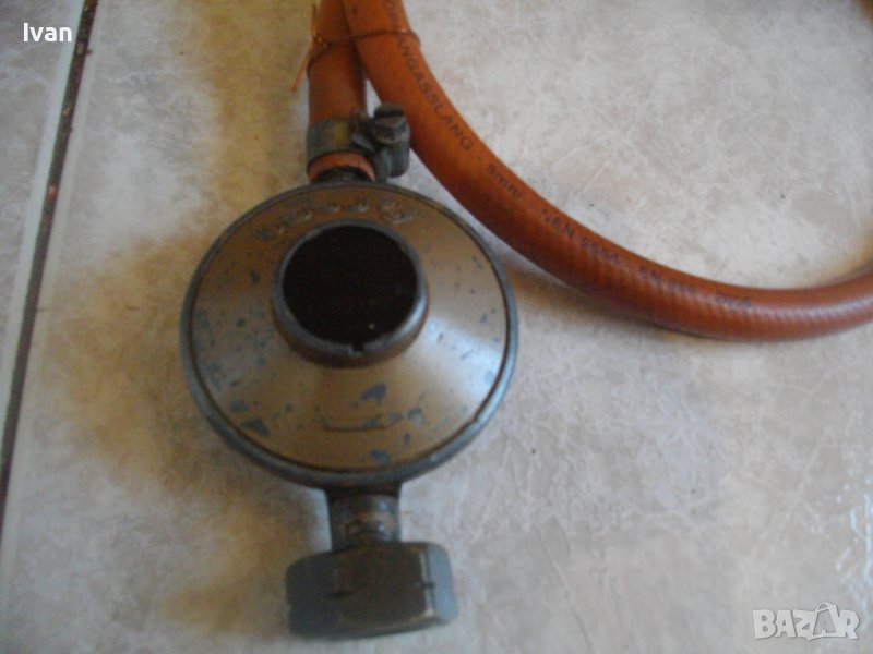 ОПИСАНИЕ на горелка за газ пропан-бутан с маркуч и поставен редуцир вентил. готова за работа. Цена 149 лв. Старо качество. Дръжка горелка изцяло от бакелит. Въртелива. Регулация отзад на налягане. Бронзова задна и предна части. Отпред поставеният накрайник е разкъсан, но може да се ползва и така. Цялостна дължина на горелката - 285мм. Поставен немски маркуч 60 см дължина. Поставен редуцир вентил /клапан налягане - италиански - марка REGA. Производител на вентила - CAGARNA GROUР. Капацитет на вентила - 30 mbar- 1500 kg/ h.