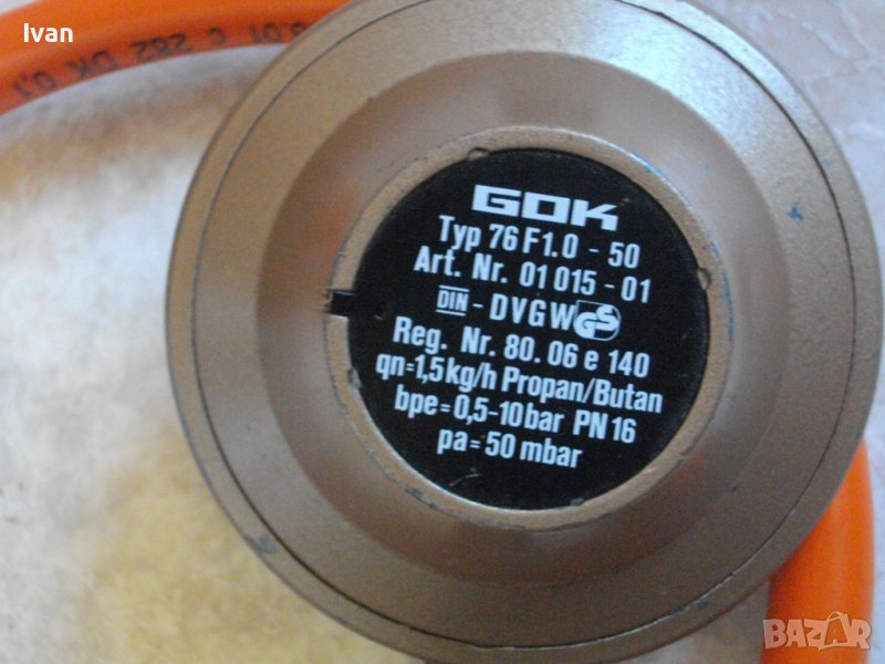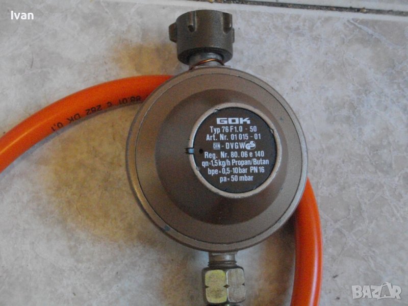 ОПИСАНИЕ НА нов редуцир вентил/клапан налягане за газ пропан-бутан 50 mbar. Жълтият бронзов. с поставен оригинален маркуч. Цена 79 лв. Съвсем нов, неизползвапни неупотребяван. Марка/модел на вентила - GOK Typ 76F 1.0-50.