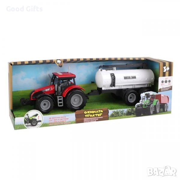 Трактор с ремарке, натоварено с резервоари за вода, отварящ се капак, светлини и звуци за работа на трактора, клаксон и заден ход.