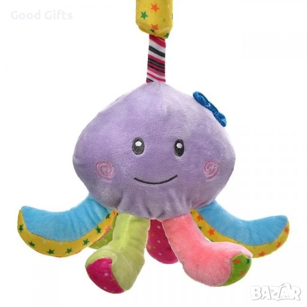 Цветна висяща играчка октопод със звук. Може да се закачи на количката или кошарата на бебето. Помага за развитието на сетивата, звукът релаксира, а цветните дизайни занимават приятно детето.