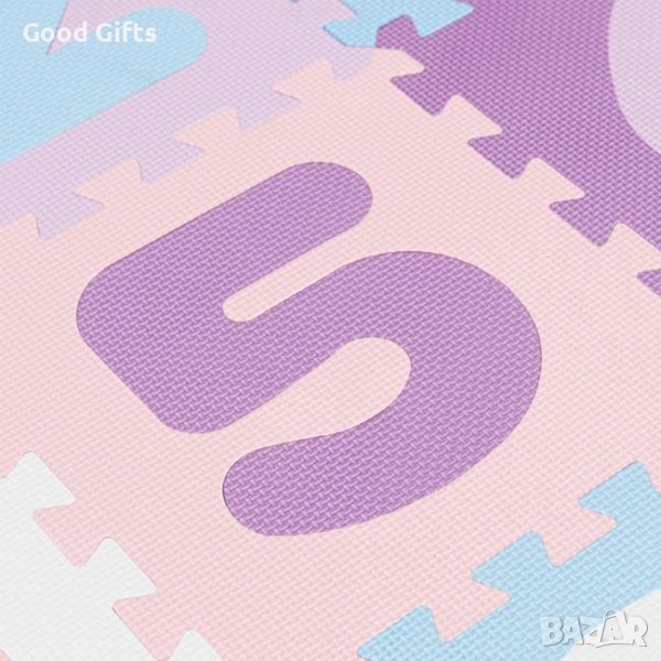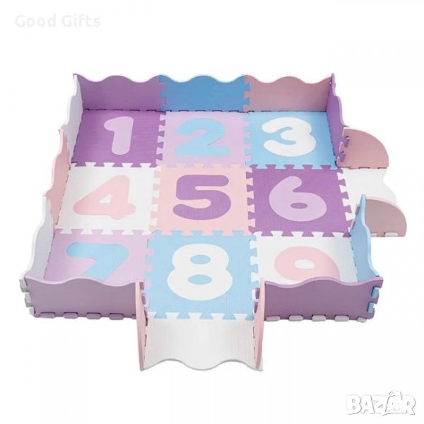 Персонализиран пъзел - ограда по периметъра и 2 входа. Основният килим се състои от 9 квадратни части в бяло, розово, лилаво и лилаво с цифри от 1 до 9 (цифрите могат да се премахват). По периметъра е поставена ограда с вълнообразни парчета и 2 отвора за влизане на детето в пространството. Този килим може да се използва първоначално от бебета, заграждението осигурява усещане за сигурност и бебето развива усещането за допир чрез докосване на текстурираните, но меки части.