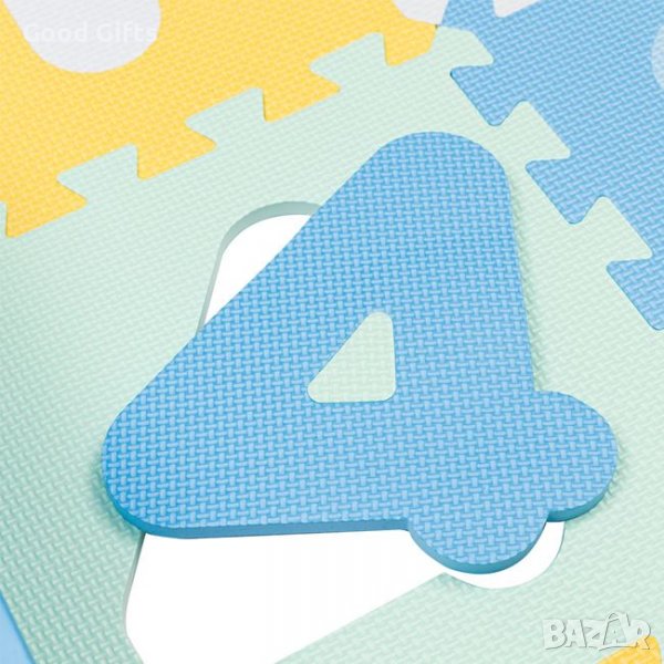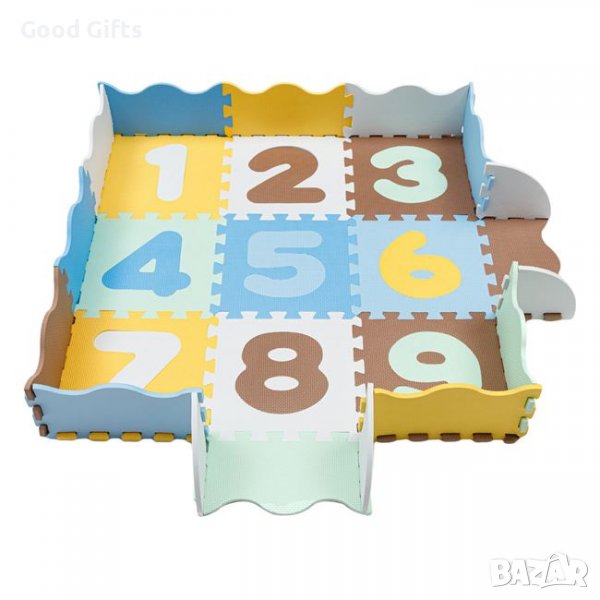 Персонализиран пъзел - ограда по периметъра и 2 входа. Основният килим се състои от 9 квадратни части с цифри от 1 до 9 (цифрите могат да се премахват). По периметъра е поставена ограда с вълнообразни парчета и 2 отвора за влизане на детето в пространството. Този килим може да се използва първоначално от бебета, заграждението осигурява усещане за сигурност и бебето развива усещането за допир чрез докосване на текстурираните, но меки части.