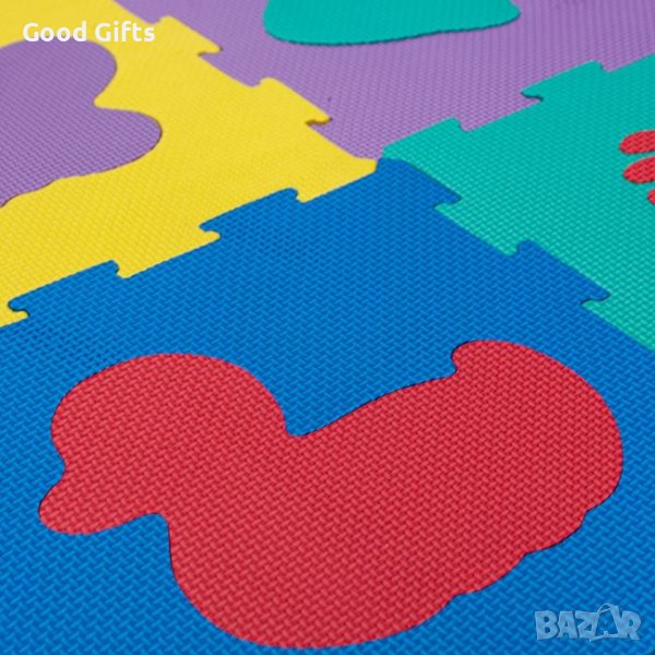 Подов пъзел с пенести меки цветни части, които се сглобяват като пъзел и създават удобна повърхност за безопасна детска игра. С рисунки на животни, които образоват и забавляват детето.