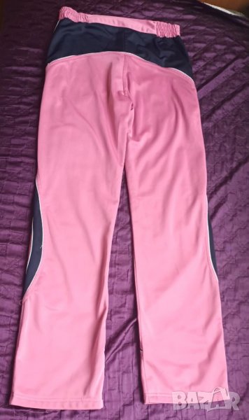 Дамски спортен екип , размер L. Материя Рашел, която не се разтяга. Размери горнище от рамо до рамо 38 см, подмишница 48 см, дължина 59 см, дължина ръкав 61 см. Долнище талия 34 см. Разтяга се до 40 см в талията, ханш 48 см, дължина 101 см, дължина от чатала 75 см.