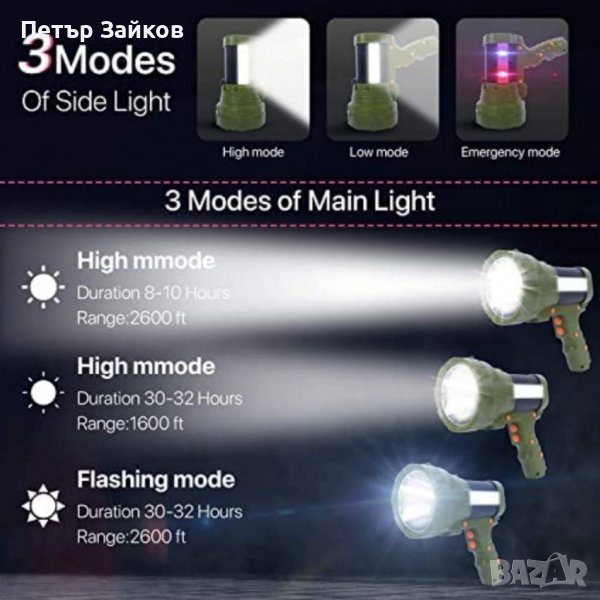 Прожектор с 10 000 лумена: Нашият външен прожектор може да генерира свръхвисока мощност до 10 000 лумена, осветяващи разстояния над 2600 фута. Ярката предна светлина има 3 светлинни режима: висока яркост, ниска яркост и светлинна яркост. Перфектен за туризъм, риболов, разходка с лодка, ветроходство, ремонти и други дейности на открито.