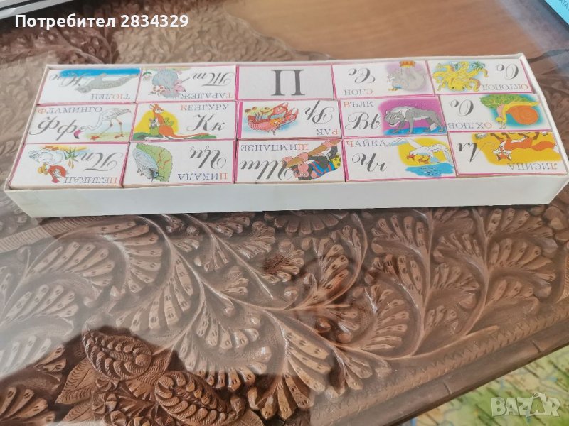 Съдържа 45 дървени плочки с цветни картинки на животни и букви.
