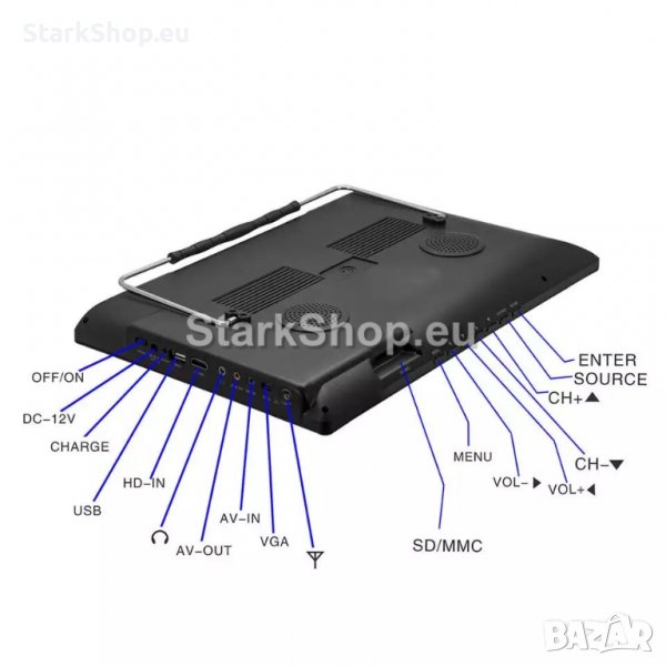 Портативен, лесно преносим Телевизор 12″ с цифров тунер и вградена акумулаторна батерия за автономна работа. Подходящ за използване при излет, в каравана, камион, кола, автобус и др. Мултимедийни функции – можете да гледате филми, клипове, да слушате музика и преглеждате снимки. AV вход за подаване на сигнал от външен източник, като DVD, сателитен, кабелен приемник, камера за задно виждане на кола, камион и др.