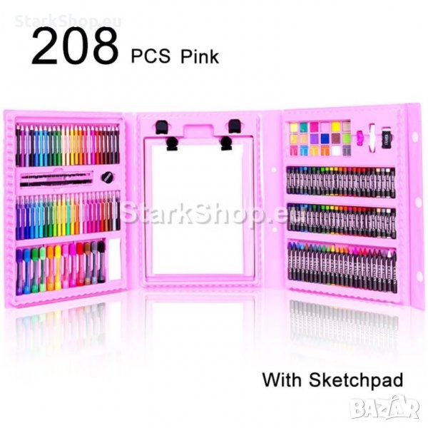 Ако детето ви е любител на изобразителното изкуство и обича да рисува, то имаме идеалният подарък, който може да му подарете. Вземете този невероятен комплект за рисуване, който се състои от 208 броя части. Той напълно ще задоволи всички изисквания на детето относно рисуването, защото включва всичко необходимо за едно истинско забавление. Комплектът съдържа 208 части: 12 броя мини маркера, 24 броя акварелни молива, 48 броя маслени пастели, 24 броя стандартни цветни моливи, 18 броя акварелни бои, 15 броя бели листа за рисуване, както и много други помощни материали.