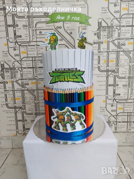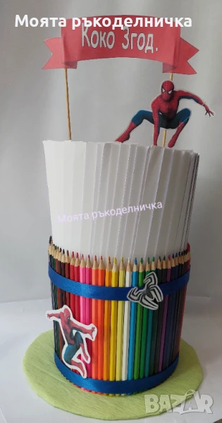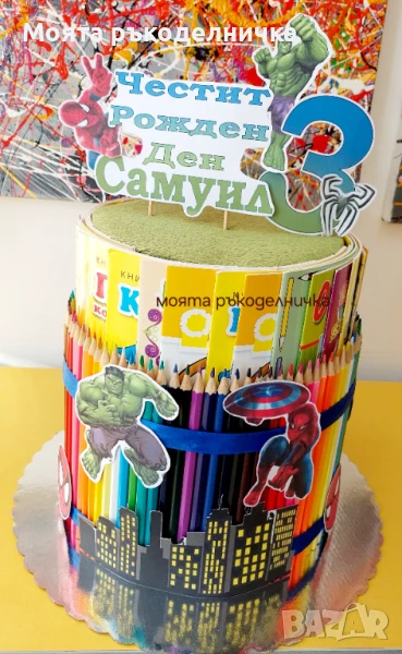Здравейте, изработвам торти от книжки за оцветяване и канцеларски материали.Тортите се изработват с тема по избор. Цената е за тортата от снимката Константин. Съдържа 20 книжки с картинки и 72 бр моливи в средата има кутия, в която може да се напълни с лакомства за децата.