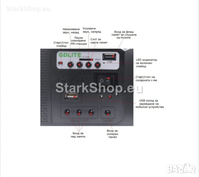 В комплекта: соларен панел, мултифункционално устройство GD-8017 Music, три LED лампи с кабели и ключове за LED осветление, USB кабел с комплект зарядни за най-разпространените модели портативни устройства. Това е устройството, което ще ви осигури нужната автономност при продължителен престой на място без електрификация.