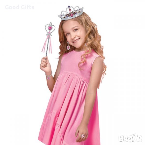 Комплект за игра за момичета с 6 аксесоара за принцеси, розови токчета със сребърен блясък и сърце, корона, обеци, пръстен, гривна и вълшебна пръчка.