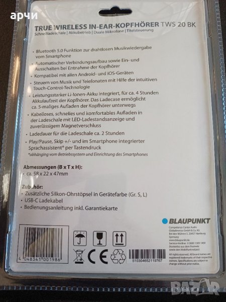 Blaupunkt True Wireless слушалки за поставяне в ушите TWS 20..Чисто нови оригинални ,черни,произход Германия, цената е крайна !!!