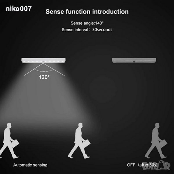 Светлината се включва незабавно, когато открие движение от 2-5 м разстояние. Светлините се изключват автоматично след около 30 секунди, ако не бъде открито движение. Лесен монтаж, самозалепваща лента 3M, може да се окачи и залепи. При монтажа не са необходими инструменти, винтове или гайки. Не се нуждаете от избор на режими, инсталирайте само батериите и автоматично се включва. Автоматично разпознаване на светлината, ако сензорът за светлина открие достатъчно светлина, той няма да се включи дори при засичане на движението на човек.