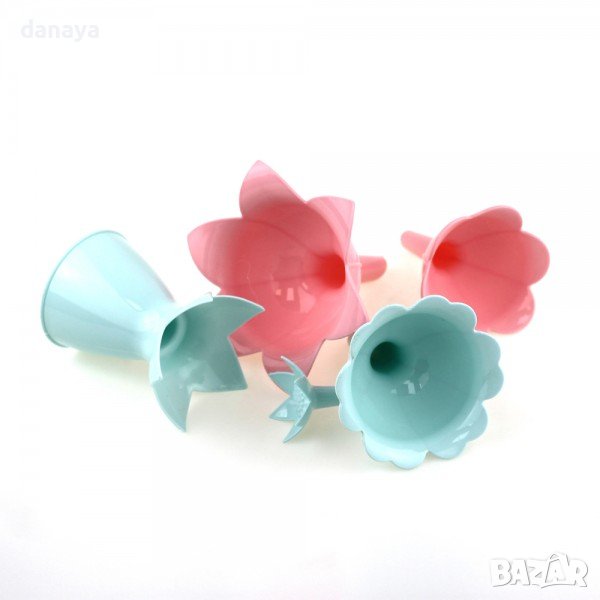 Комплект от 3 броя кухненски фунии, подредени една върху друга на поставка. Освен, че са практични, кухненските фунии могат да се използват и като декорация, тъй като целият комплект образува цвете. Всяка кухненска фуния е с форма на цвете.