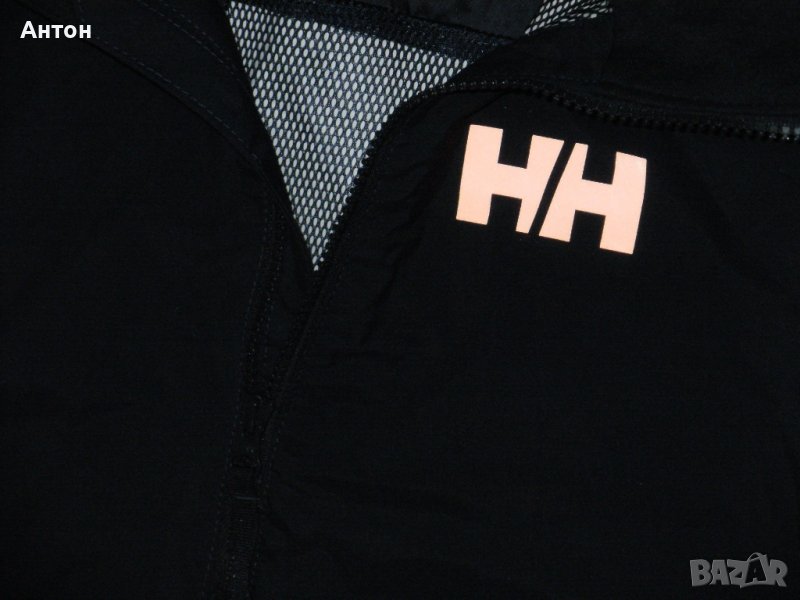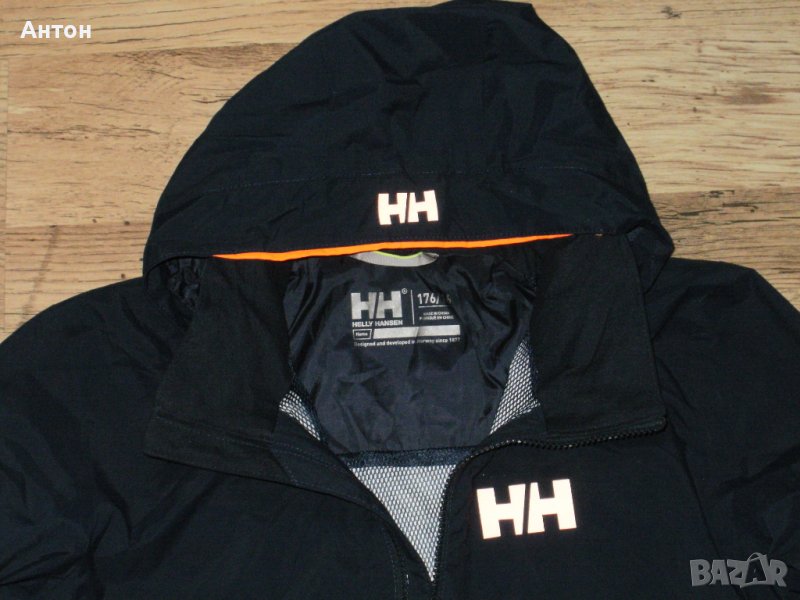 Ветровката е на HELLY HANSEN, оригинална, нова, без етикети и без забележки. По номер е 176/16, сравнете мерките. Цвета е тъмно мастилено синьо. Материята не пропуска дъжд и вятър, шевовете са лепени и шити. В яката има качулка. Закопчава се с цип, два джоба отпред с ципове. Отпред е по късо. На качуката и долу има ластик със стопери. Има лого отпред, отзад и на качулката. Ръба на качулката и всички други букви са еднакъв цвят, наситено неоново оранжево.