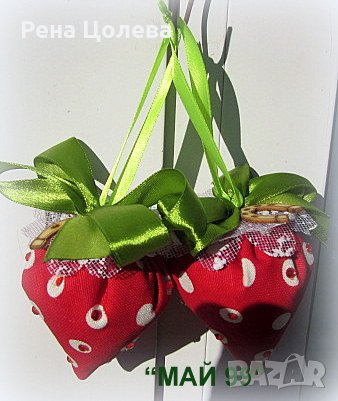 Ръчно изработени ягодки от плат-лен на точки/различни цветове/ с перлички, размер 9/6 см. само ягодката,пищна зелена панделка сатен и малка дървена подкова за късмет!