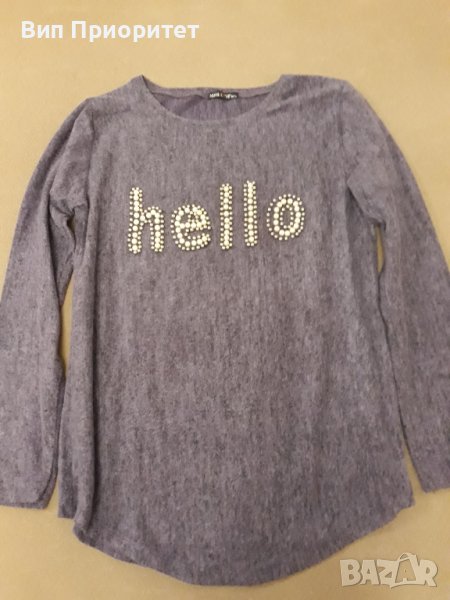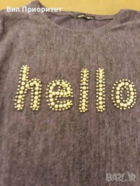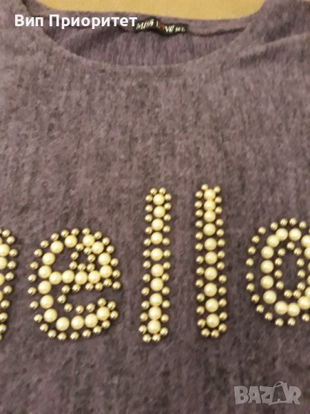 Лилава блуза Хелло - изключително приятна материя - мека , удобна, красива . Бродиран надпис с перли, много ефектен, Гърбът е изчистен.