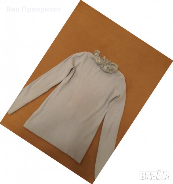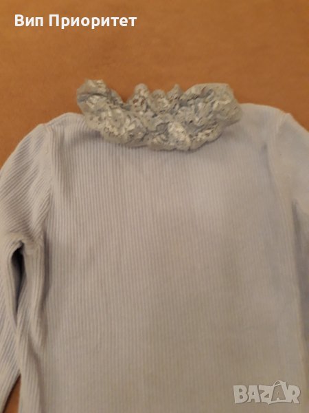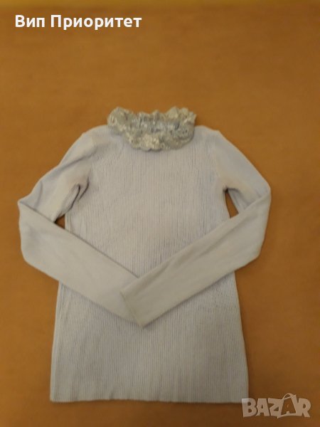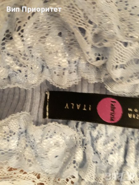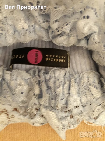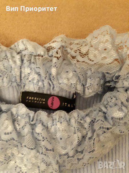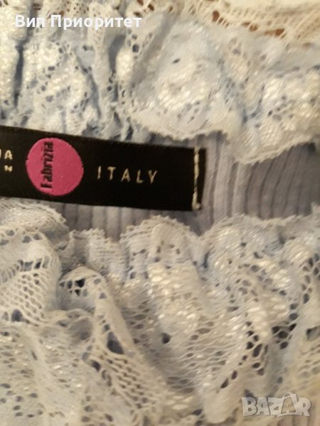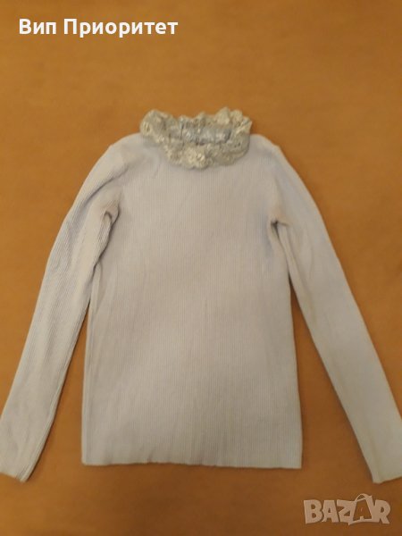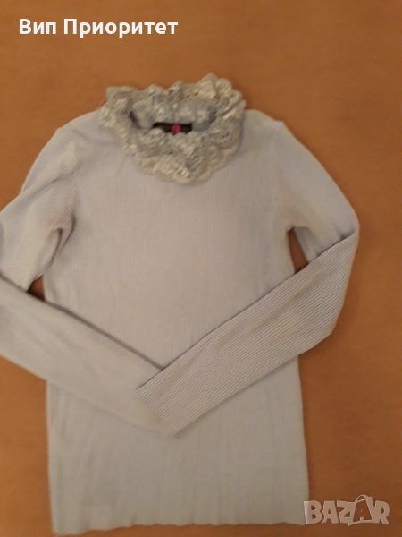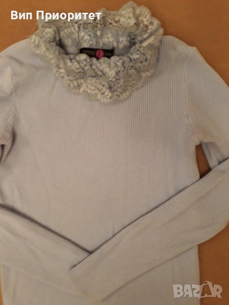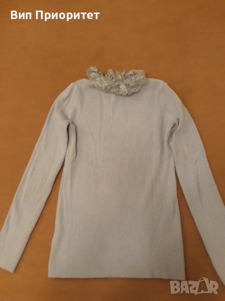 Италианска плетена светло синя блузка с дълъг ръкав , изчистена отпред и отзад и с ефектна дантелена → Обява 39217923