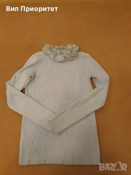 Италианска плетена светло синя блузка с дълъг ръкав , изчистена отпред и отзад и с ефектна дантелена якичка около врата , която придава женственост , нежност и я прави официален зимен модел.