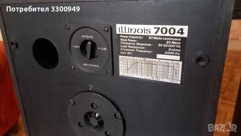Тонколони ILLINOIS 7004. Работят си много добре,пищялките са нови PHILIPS,така си бяха и оригиналните.Единият бас е леко надран от котката,но си работи без проблемно.2x80w на 8ома.В-49,Ш-31,Д-21см.