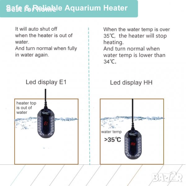 【Изключете, когато няма вода】 Моля, обърнете внимание, че това е напълно потопяем нагревател за аквариум за прясна вода и резервоар за солена вода, когато горната част на нагревателя е извън водата, той ще се изключи автоматично и светодиодът показва E1, когато е напълно във вода отново ще се върне към нормална работа