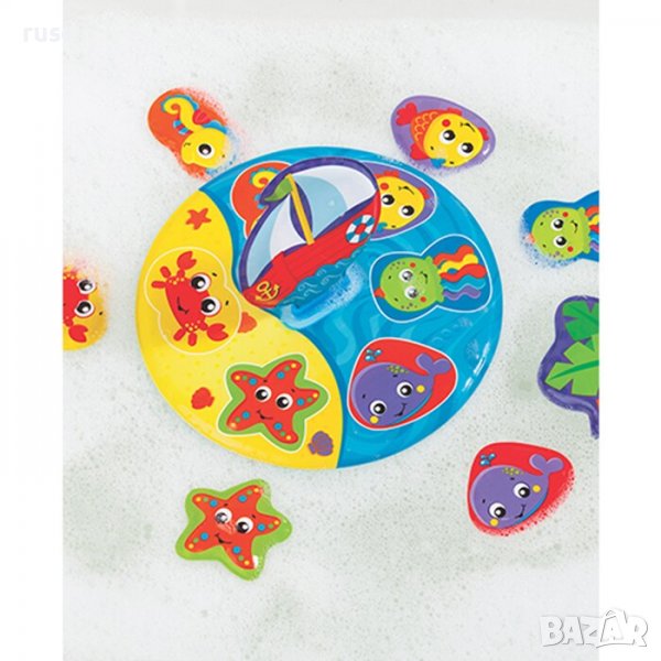Пъзелът за баня включва 9 ярки плаващи форми и 2 взаимнозаменяевми централни части. Всички части са двустранно илюстрирани за решаване на пъзел игра или за организиране на визуален дисплей върху плочките на банята. Всички части се закрепват за плочките в банята когато се намокрят.