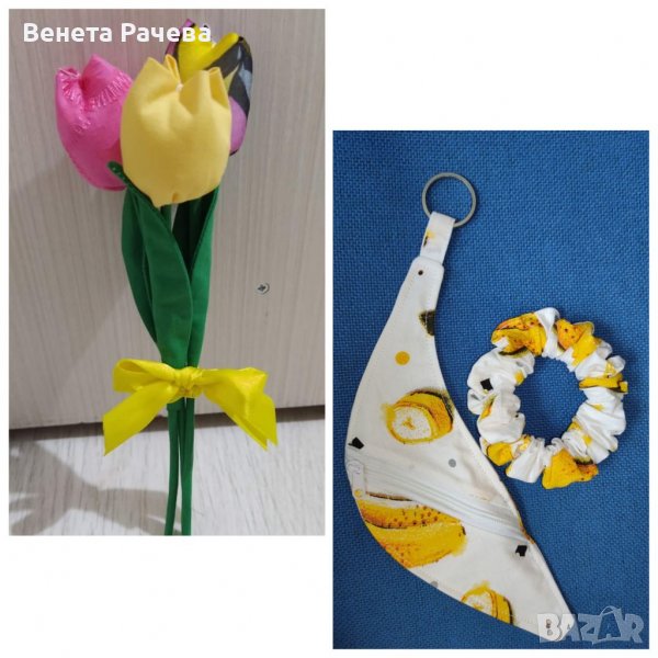 6. Букет 3 бр. текстилни цветя+портмоне-ключодържател+скрънчи за коса-22 лв