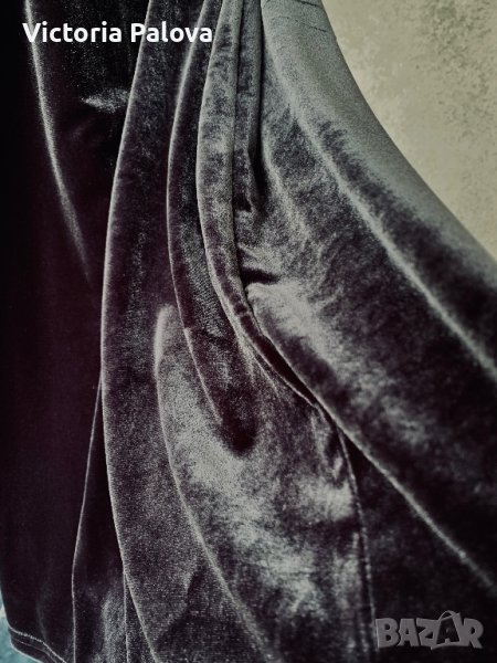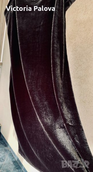 Прекрасна рокля Франция,меко блестящо кадифе графитен цвят.ГО-43-44см,дължина-82см,ханш-50см,презрамка-17см.подходяща за вечерни събития и също така и кежуал -със сако.роклята е разтеглива и е шик.