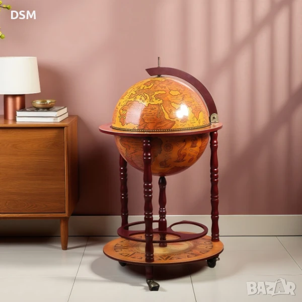 Подвижен глобус бар с място за бутилки в долната си част и място за бутилки и чаши от горната.