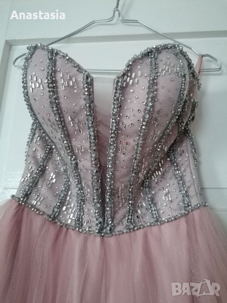 Рокля в нежно розов цвят, с пришити камъни в сребристо по корсета, с розова подплата и няколко пласта тюл със златисти отенъци. Размерът е С-М, като корсета са коригира. Височината е съобразена за 1.70см. Носена няколко часа, минала химическо чистене.