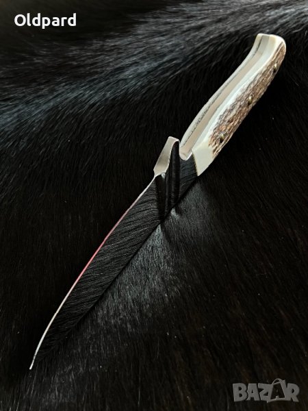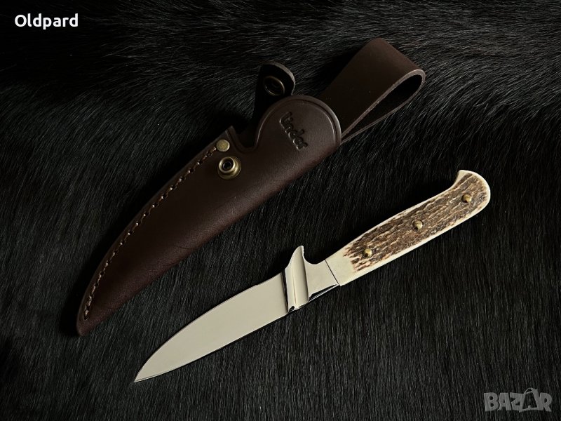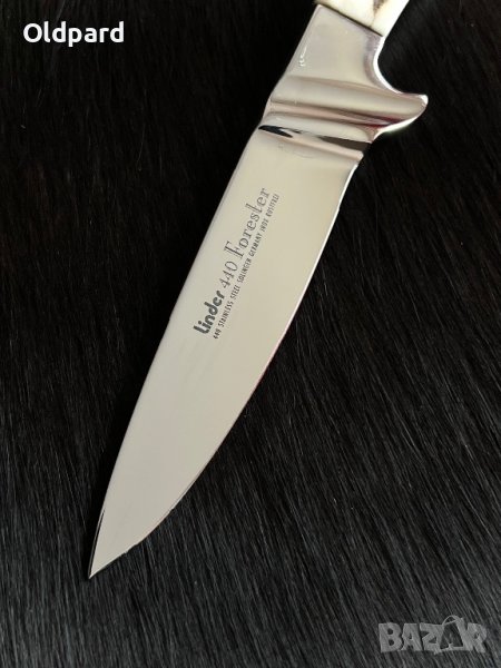 Ловен немски нож Linder Forester (Solingen). Рядък екземпляр. Отличен пример за баварско качество. Полирана стомана и перфектно изпълнение. Острие от стомана 1.4110, Full Tang с вграден гардове. Дължина на острието 10 см, обща дължина 21,5 см. Дръжка - еленов рог. Традиционна кожена кания . Това е прекрасен подарък за мъж за всякакви празнични поводи.