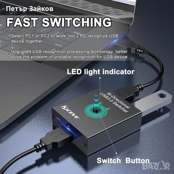 1. С този превключвател USB 3.0 2 компютъра или преносими компютри могат да споделят 1 USB устройство като принтери, скенери, клавиатури, мишки, USB флаш устройства, външни твърди дискове и др.