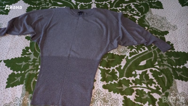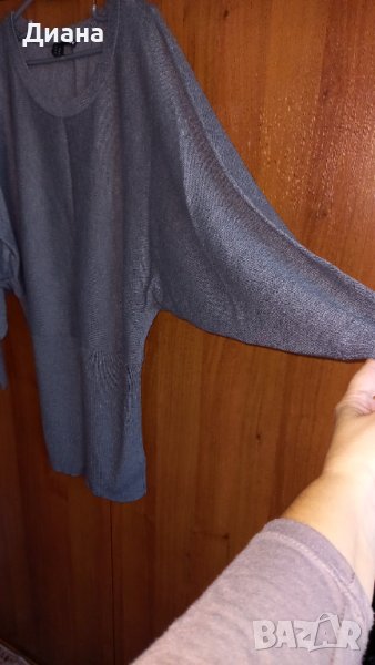 Сива мека туника от фино плетиво, ръкав тип прилеп, което я прави универсален размер от М до ХЛ. Долната част е стеснена и позволява да се носи и като блуза, вдигната високо под бюста. Дълж.77, ГО 70 до 80см едностранно, има разтегливост.