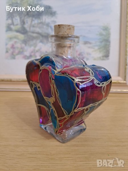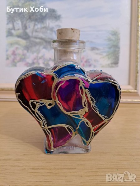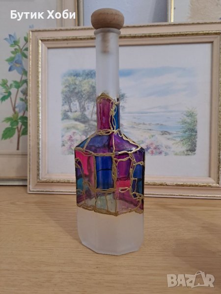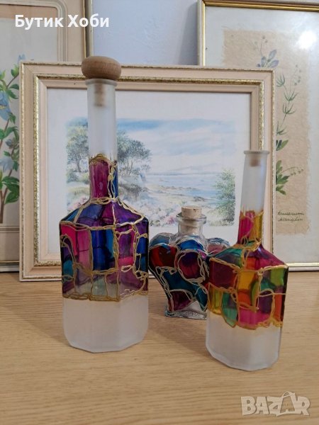 Лот авторски рисувани шишета в техника ,,витраж,, Ефектни са с яркия и наситения си цвят. В отлично състояние са! Забележки има само по едното от шишета - излющена боя :( / снимка/ Размери - 26, 19 и 12см.К//9