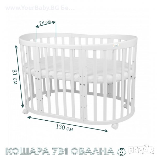 Нашата овална кошара 7в1 е плод на дългогодишен труд и опит. Изработена е от букова дървесина, която се отличава със здравина и същевременно лекота. Тази мебел за деца ще се превърне в основна украса на интериора и функционално оборудване. Ще осигури на вашето мъниче спокоен и безопасен сън.