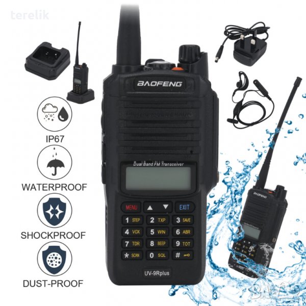 Представяме Ви най-новият модел професионална радиостанция Baofeng UV-9R! Моделът е с множество подобрения и иновации, увеличен обхват и дълготрайна батерия. Станцията е супер устойчива и херметична, изцяло ударо, прахо и водо устойчива и може да работи под вода. Уникална станция независеща от околната среда, влажност или запрашеност, която има възможност да следи и двете честоти едновременно - Simplex TDR function. Обхватът е забележителен - 20-30 км в гора или пресечена местност. Напълно подходяща за лов, риболов с лодки, къмпинг, ски, планинарство, охранители и служители на молове, ресторанти или търговски комплекси.