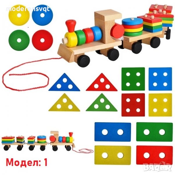 Комплектът съдържа локомотивче с въженце за дърпане, две вагончета и формички за напасване.