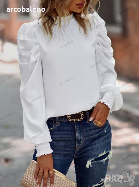 Дамска едноцветна блуза с дълъг ръкав с фалшиво деколте и маншет, 2цвята - 023