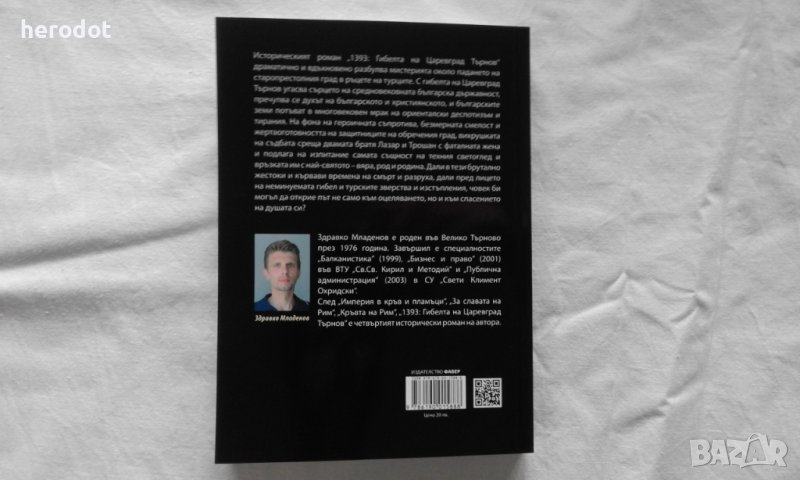 Историческият роман „1393: Гибелта на Царевград Търнов“ драматично и вдъхновено разбулва мистерията около падането на старопрестолния град в ръцете на турците. С гибелта на Царевград Търнов угасва сърцето на средновековната българска държавност, пречупва се духът на българското и християнското, и българските земи потъват в многовековен мрак на ориенталски деспотизъм и тирания. На фона на героичната съпротива, безмерната смелост и жертвоготовността на защитниците на обречения град, вихрушката на съдбата среща двамата братя Лазар и Трошан с фаталната жена и подлага на изпитание самата същност на техния светоглед и връзката им с най-святото – вяра, род и родина. Дали в тези брутално жестоки и кървави времена на смърт и разруха, дали пред лицето на неминуемата гибел и турските зверства и изстъпления, човек би могъл да открие път не само към оцеляването, но и към спасението на душата си?